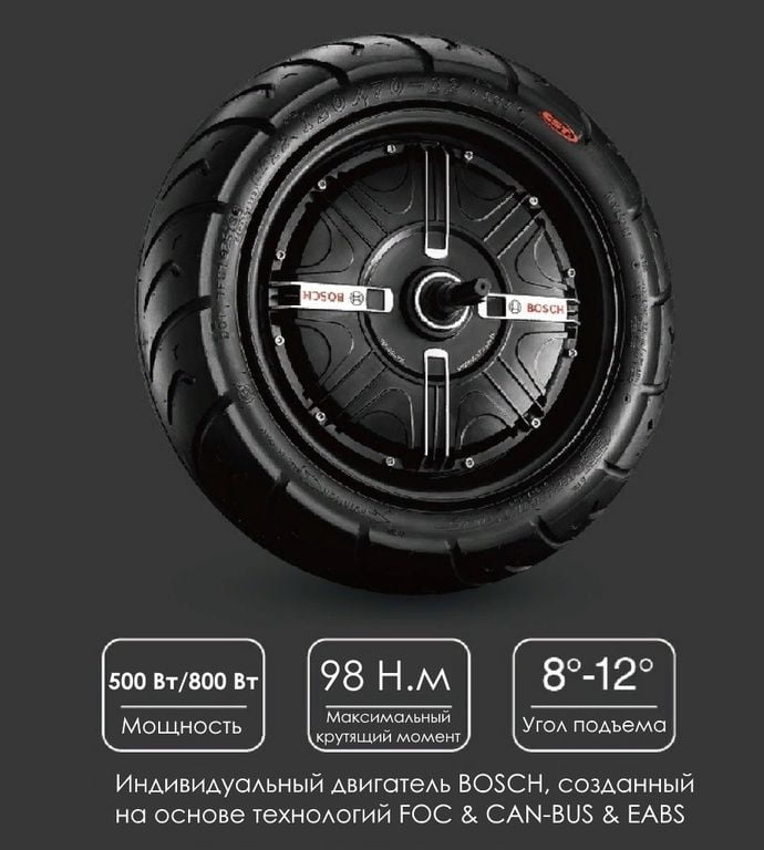 Этот электроскутер оснащён мотор колесом немецкого бренда Bosh с номинальной мощностью 1000W и частатой вращений 400rpm .Имеет 1 режим «D» и 1 режим «R» ,максимальная скорость ограничена программно и составляет 25км/ч.