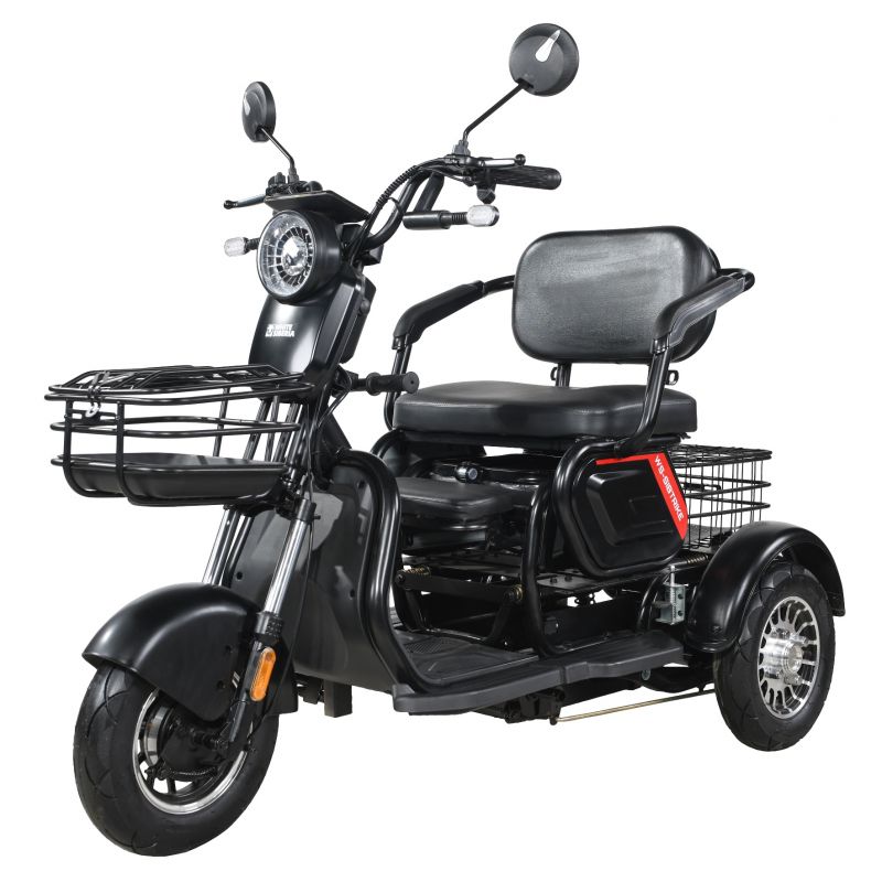 Электроскутер оснащён передней и задней корзинами, которые позволяют удобно перевозить личные вещи, сумки или покупки.