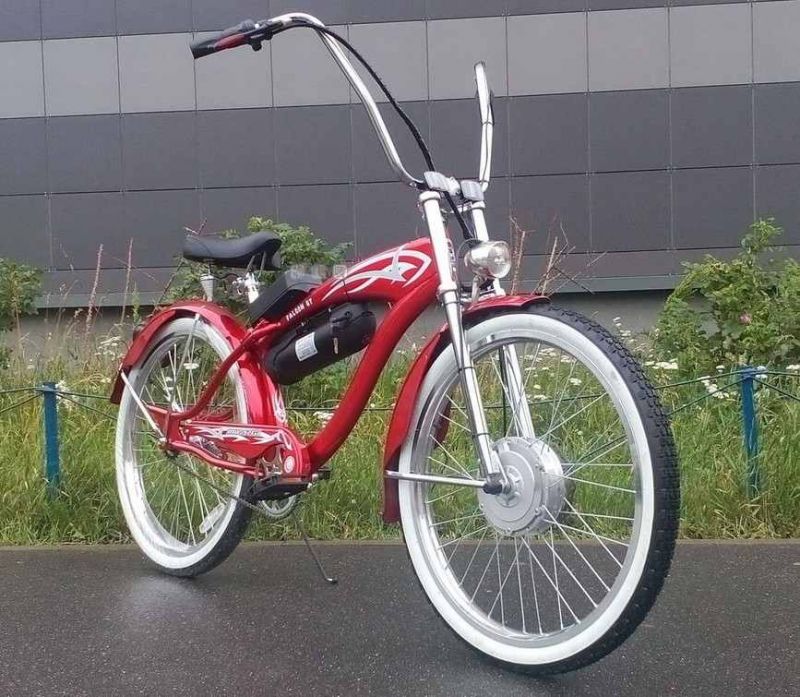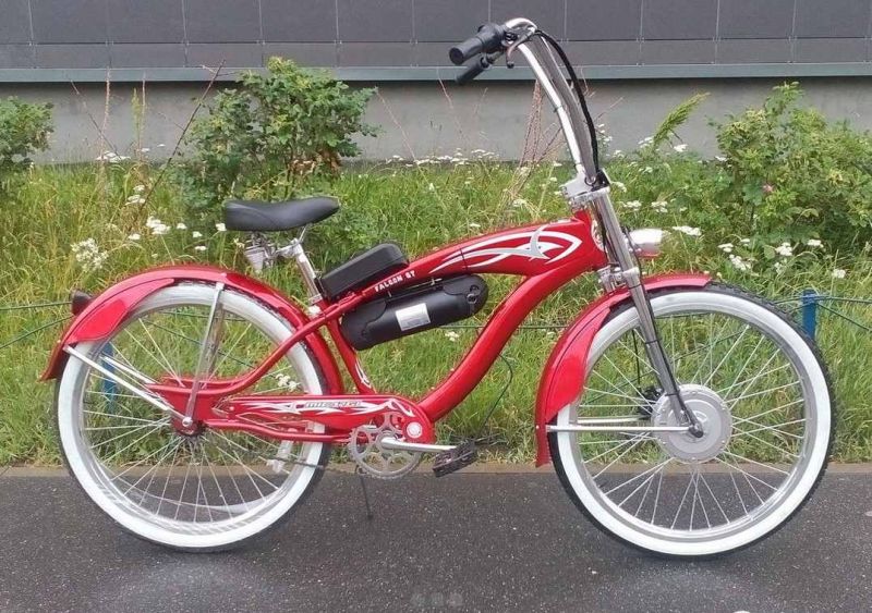 Электровелосипед Чоппер Micargi Falcon GT 36V 500W оснащен редукторным мотор колесом Bafang мощностью 500Вт. 36В. При изготовлении круизера за основу взята модель Miсargi Falсon Burgundi. Установлена съемная батарея на 11 А/ч. Чоппер развивает скорость до 35км/ч. и может проехать дистанцию в 35 км. без помощи педалям. Если еще и педалями помогать в режиме pedal assistant, дистанция существенно увеличивается. Установлены профессиональные дисковые тормоза и спереди и сзади. Колеса 26» и 2.1» толщиной. Обода усиленные двойные 46мм. Рама стальная, красного цвета. Комфортное сиденье с амортизаторами для настоящих ценителей удовольствия за рулем байка.