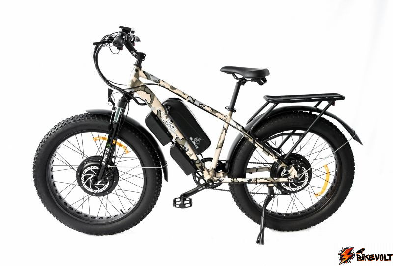 ELBIKE PHANTOM TWIX (camouflage) – ограниченная версия популярной модели в модном цвете камуфляж. Эта двухмоторная версия серии PHANTOM напряжением 48 вольт, оборудованная 2 мощными безредукторными моторами MXUS по 500 ватт каждый, расположенными в переднем и заднем колесе и повышенной ёмкостью литий-ионным аккумулятором 48в 16а, что позволяет максимально разгоняться до 50 км/час и проезжать расстояния до 70 км без помощи педалей, используя только ручку газа, и до 120 км в режиме педалирования. Наличие двух моторов позволяет с легкостью перемещаться в условиях гористой местности. На руле находятся переключатели, с помощью которых можно выбирать удобный в различных ситуациях режим езды – только на переднем моторе, только на заднем, или использовать полный привод. Так же данная модель оборудована гидравлическими тормозами и задним багажником.
