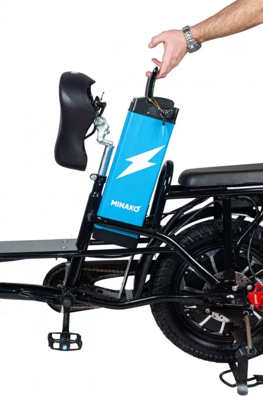 Minako Monster — грузовой электровелосипед с багажником объемом 120 л и грузоподъемностью до 150 кг. Мощная литий-ионная батарея емкостью 504 Wh позволяет проехать до 80 км. Комфортные амортизаторы, регулируемая высота сиденья и удобные педали обеспечивают эргономичность и комфорт. Прочная и функциональная конструкция делает этот велосипед идеальным для курьерской доставки.