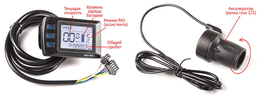 В состав комплекта входит управляющий велокомпьютер OMT-M3 с LCD-дисплеем, на котором отображаются все необходимые показатели. Ручка акселератора устанавливается на правой грипсе и позволяет передвигаться на велосипеде в режиме «скутера», не прибегая к вращению педалей.