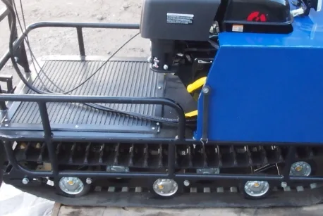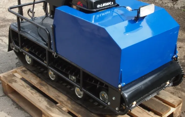 - мотобуксировщик разбирается на части — двигатель, рама с гусеницей, капот.