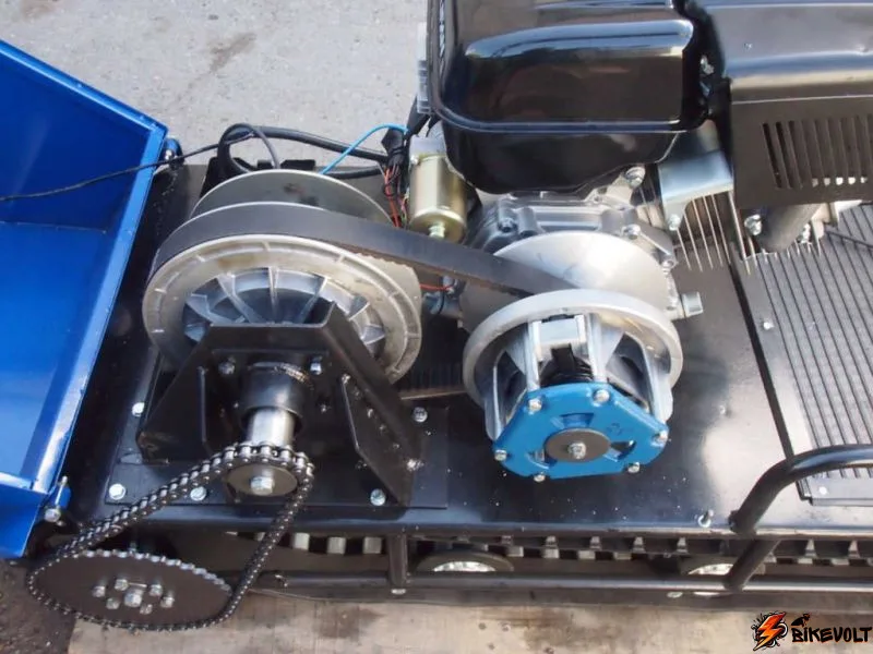 - мотобуксировщик разбирается на части — двигатель, рама с гусеницей, капот.