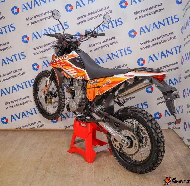 Мотоцикл Avantis Dakar 250 Twincam с ПТС — 250-кубовый байк с водяным охлаждением мотора и карбюраторной системой подачи топлива. Неприхотлив в обслуживании, вынослив, рассчитан на поездки по бездорожью и пересечённой местности. За руль двухколёсника можно садиться с 16 лет при наличии опыта вождения. Байк доступен в трёх цветах: синий, зелёный, оранжевый. Мотоцикл предназначен для поездок по бездорожью и пересечёнке.