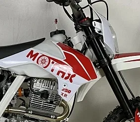 Мотоцикл Motax XR 250 — динамичный байк с мощным бензиновым 4-тактным мотором, электростартером и стальной рамой. Обьем двигателя 250 см куб. Внедорожные колеса отлично справляются с маршрутами по пересеченной местности. Диаметр передних колес 21 дюйм, задних 18 дюймов. Модель оснащена дисковой гидравлической тормозной системой. Благодаря прочной и качественной раме максимальная нагрузка достигает 120 кг.