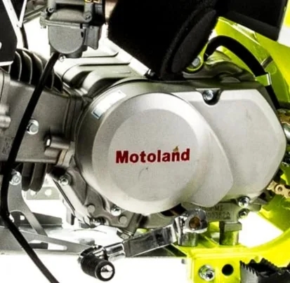 Мотоцикл Motoland Кросс 125 MX125 E (2020 г.) — мощный байк с усиленными характеристиками. Питбайк оснащён карбюратором Mibbi 24 с фильтром нулевого сопротивления и одноцилиндровым четырёхтактным двигателем с воздушным охлаждением. Надёжный мотор мощностью 9 л. с. и объемом 125 см³ разгоняет кроссовый мотоцикл MX125 KKE до 90 км/ч. Рама полудуплексная стальная, мотоцепь качественная. Колёса спицованные, сделаны из прочного и лёгкого алюминия. Размер заднего колеса — 14 дюймов (350 мм), переднего — 17 дюйм (430 мм). Тормоза дисковые, передний тормозной суппорт двухпоршневой, задний — однопоршневой.