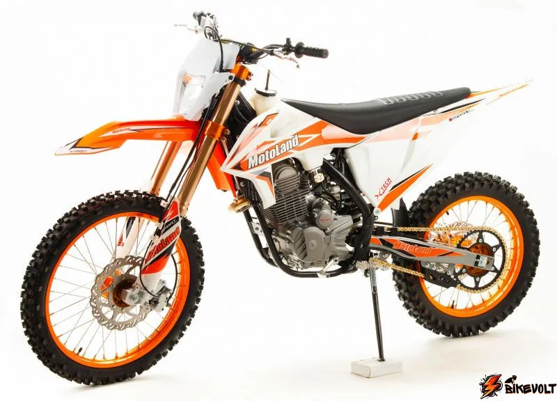 Мотоцикл MOTOLAND SX 250 (172FMM) — стильный кроссовый мотоцикл для езды по городу и бездорожью. Отлично подходит для соревнований по мотокроссу. Двигатель мощностью 21 л. с. позволяет набирать разгон до 120 км/ч. Имеет хорошую проходимость, прекрасно ведёт себя на песке и грунте, подходит для асфальтовых дорог. Рама и пластик — аналог КТМ. Колеса 21/18, улучшеной тормозной системой (аналог Brembo), прогрессией на игольчатых подшипниках. Полностью регулируемая подвеска фирмы GPX, Глушитель прямоточный с пружинным креплением и резонатором.