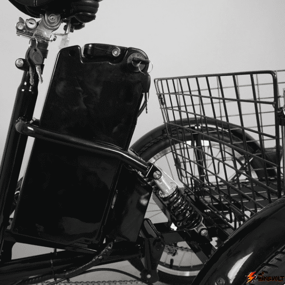 Трехколёсный электровелосипед Omnibike 350W с большим сиденьем — новая модель в каталоге bikevolt.ru, задней грузовой корзиной и передней корзиной. Батарея расположена под сиденьем.