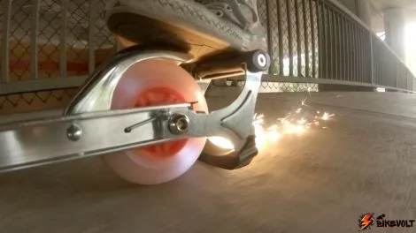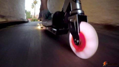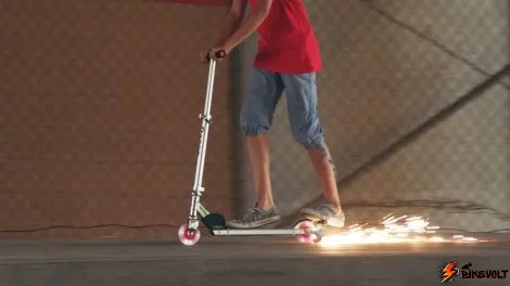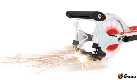 Spark Ultra – самый яркий самокат, оснащённый красочными светящимися колёсами, которые не требуют элементов питания, а также фирменным искрогенератором в виде тормоз-педали над классическим тормоз-крылом.