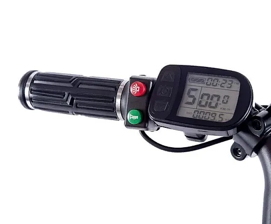 • Для удобства руль привода регулируется по высоте и имеет ЖК дисплей, на котором вы можете посмотреть: время, уровень заряда АКБ, скорость и пробег. Также на руле есть датчик, который позволяет выставлять скоростной режим. Максимальная скорость, на которой вы моете проехать, составляет около 15 км/час