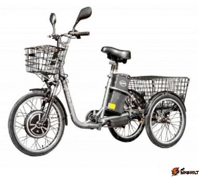 Vega Happy 500w для дачи просто превосходный вариант, можно смело сказать, что это настоящий грузовой элеткротрицикл, ведь он оборудован двумя корзинами для перевозки грузов: одна на руле, а вторая большая сзади (ее можно даже закрывать на замок). Мощное мотор-колесо 500 Вт стоит на переднем колесе, причем редуктора и шестеренок нет, лишь магнитная обмотка, что обеспечивает большую надежность. Ездить можно тремя способами: только с помощью электротяги и ручки газа, на педалях или в 3-уровневом режиме PAS, то есть когда двигатель помогает при вращении педалей. Размеры колес разные: переднее большего диаметра (24 дюйма), задние меньше (20 дюймов).