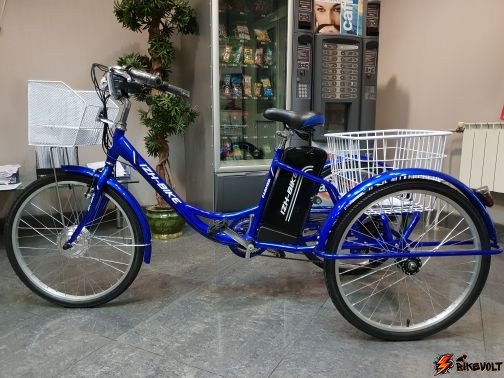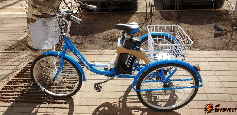 Электровелосипед IZH-BIKE FARMER – трёхколёсный электровелосипед, снабжённый электродвигателем мощностью 250W. Скорость такой байк развивает до 25 км/ч. Чтобы привести его в движение можно воспользоваться обычными педалями или нажать ручку газа – например, если необходимо подниматься в гору. Трицикл снабжён двумя корзинами. Передняя имеет размеры 34*25*23 см, задняя 56*38*30. Длина трицикла в собранном виде 180 см, ширина — 80 см по задним колёсам. Вес – 40 кг. Дизайн велогибрида радует глаза: это яркие синие и красные модели, которые выглядят очень аккуратно. По сравнению с бензиновым транспортом трицикл IZH-BIKE FARMER намного более экологичен и экономичен. Трицикл укомплектован литий-ионным аккумулятором 36в ёмкостью 10Ah. Это значит, что его хватает на 45-50 километров при одном заряде. Трицикл способен стать незаменимой «рабочей лошадкой» для тех, кому необходимо перевозить грузы на небольшие расстояния. Отправиться на рынок за продуктами или развезти товары по городу с таким электробайком – одно удовольствие. В задней корзине можно перевозить грузы массой до 40 кг, а передняя дополнительная корзина удобна для сумок. Электрический велосипед Иж-Байк Фермер — электротрицикл будет особенно удобен для людей пожилого возраста или с ограниченными физическими возможностями. Кроме того, данный трицикл очень устойчив: в таком велосипеде можно перевозить ребёнка, не опасаясь, что конструкция завалится.
